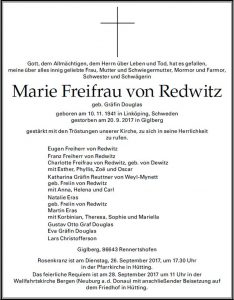 Traueranzeige Redwitz 23. September 2017Keine Kommentare Gefällt Ihnen der Inhalt? Teilen Sie ihn mit Ihren Freunden. Facebook Twitter Google Plus Linked In Email Beitrags-Navigation Nachruf Marie Freifrau v. Redwitz