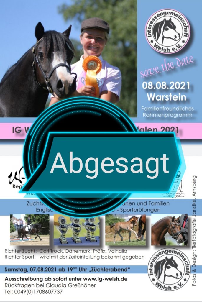 Diese Veranstaltung musste leider abgesagt werden! Kurzausschreibung - Regionalschau Westfalen in Warstein am 08.08.2021 (vorbehaltlich der gültigen, aktuellen Coronaschutzverordnung) Ort: Reitanlage Kim Mündelein, Plaßkamp 14, 59581 Warstein Veranstalter: IG Welsh Regionalgruppe Westfalen und Welsh Sportverein [...] Continue Reading