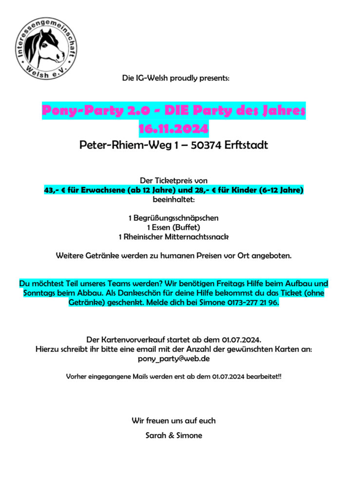 Pony Party 2.0 Die IG-Welsh proudly presents: Pony-Party 2.0 – DIE Party des Jahres 16.11.2024 Peter-Rhiem-Weg 1 – 50374 Erftstadt Der Ticketpreis von 43-, € für Erwachsene (ab 12 Jahre) und 28,- € für Kinder (6-12 Jahre) beeinhaltet: 1 Begrüßungsschnäpschen 1 Essen (Buffet) 1 Rheinischer Mitternachtssnack Weitere Getränke werden zu humanen Preisen vor Ort angeboten. Du möchtest Teil unseres Teams werden? […] Continue Reading