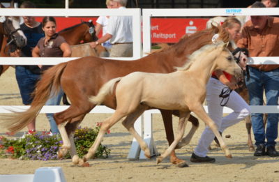 Auch bei den Welsh B wurden der Kommission sieben Fohlen vorgestellt. Hier siegte die Programmnummer 284, der Palominohengst „Liebhart`s Sunshine“, geb. 13.04.2019, Abstammung: Cadlanvalley Sir Ivanhoe/ Bünteeichen Millennio/ Sprigstar`s Spirit. Züchter und Besitzer: Rolf Liebhart, Detmold. Reservesieger auf dem Ring wurde die Programmnummer 283, aus der Zucht und dem Besitz von Barbara Seier, Raesfeld. Diese am 19.04.2019 geborene Schimmelstute stammt ab von Mayloo. Beide Fohlen erhielten die Goldmedaille, alle anderen Fohlen wurden nicht rangiert.