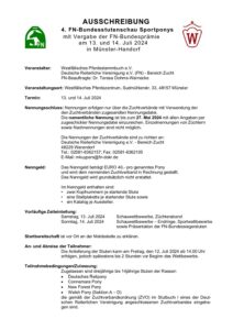 Ausschreibung FN-Bundesstutenschau Sportponys Münster 3. April 2024Keine Kommentare Gefällt Ihnen der Inhalt? Teilen Sie ihn mit Ihren Freunden. Facebook Twitter Google Plus Linked In Email Beitrags-Navigation Ausschreibung FN-Bundesstutenschau