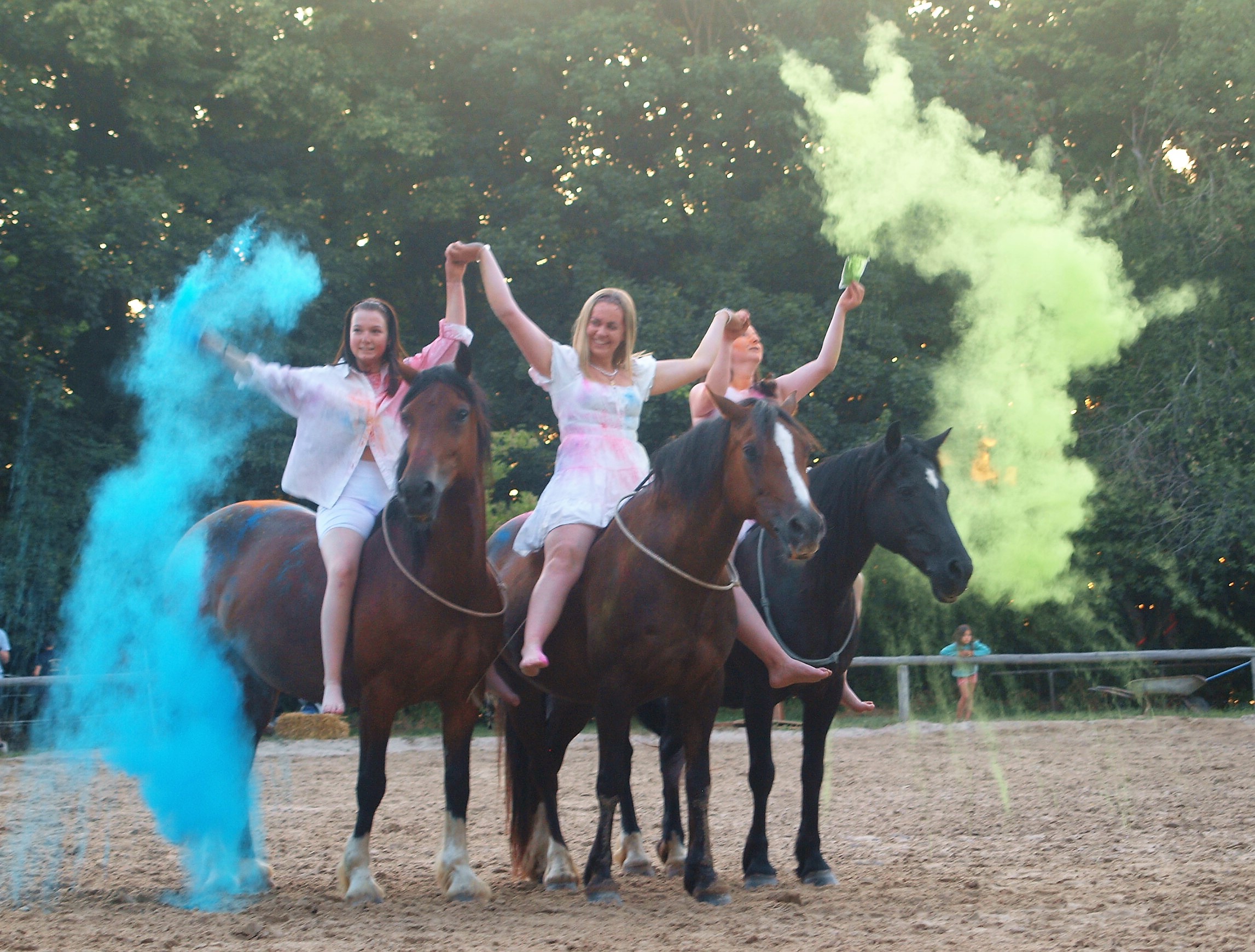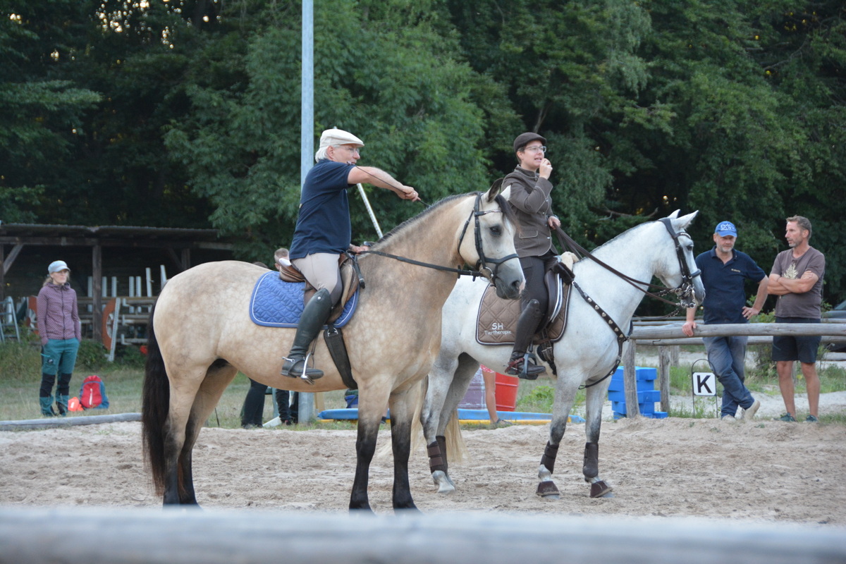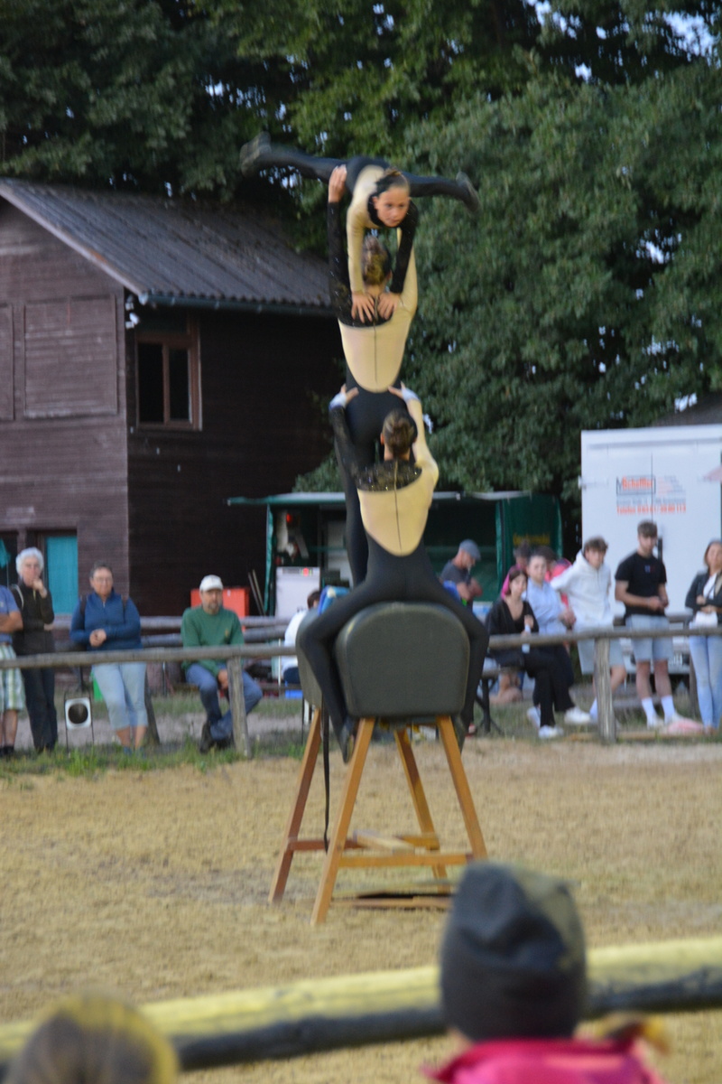 Jump & Dog hieß das nächste Schaubild, welches sehr zur Belustigung von Zuschauern und Teilnehmern sorgte. Ein kleiner Parcours musste schnellstmöglich von Hund und Frauchen/Herrchen überwunden werden, was bei weitem nicht so einfach war, wie es zunächst schien. Manch kleiner Hund zog den Weg unter der Stange vor, manch anderer dachte sich, rechts- oder linksherum ist doch viel einfacher. Nach einem gekonnten Langzügelauftritt zeigte eine Pofi-Voltigiergruppe ihr hervorragendes Können. Sie turnten zwar nur auf dem Holzpferd, versicherten aber, dass sie diese Übungen auch auf einem galoppierenden Pferd machten. Nach einer Garotcha-Vorführung imponierte eine junge Reiterin auf ihrem schnellen, wendigen Quarterhorse-Hengst das Publikum mit einem Fackelreining.