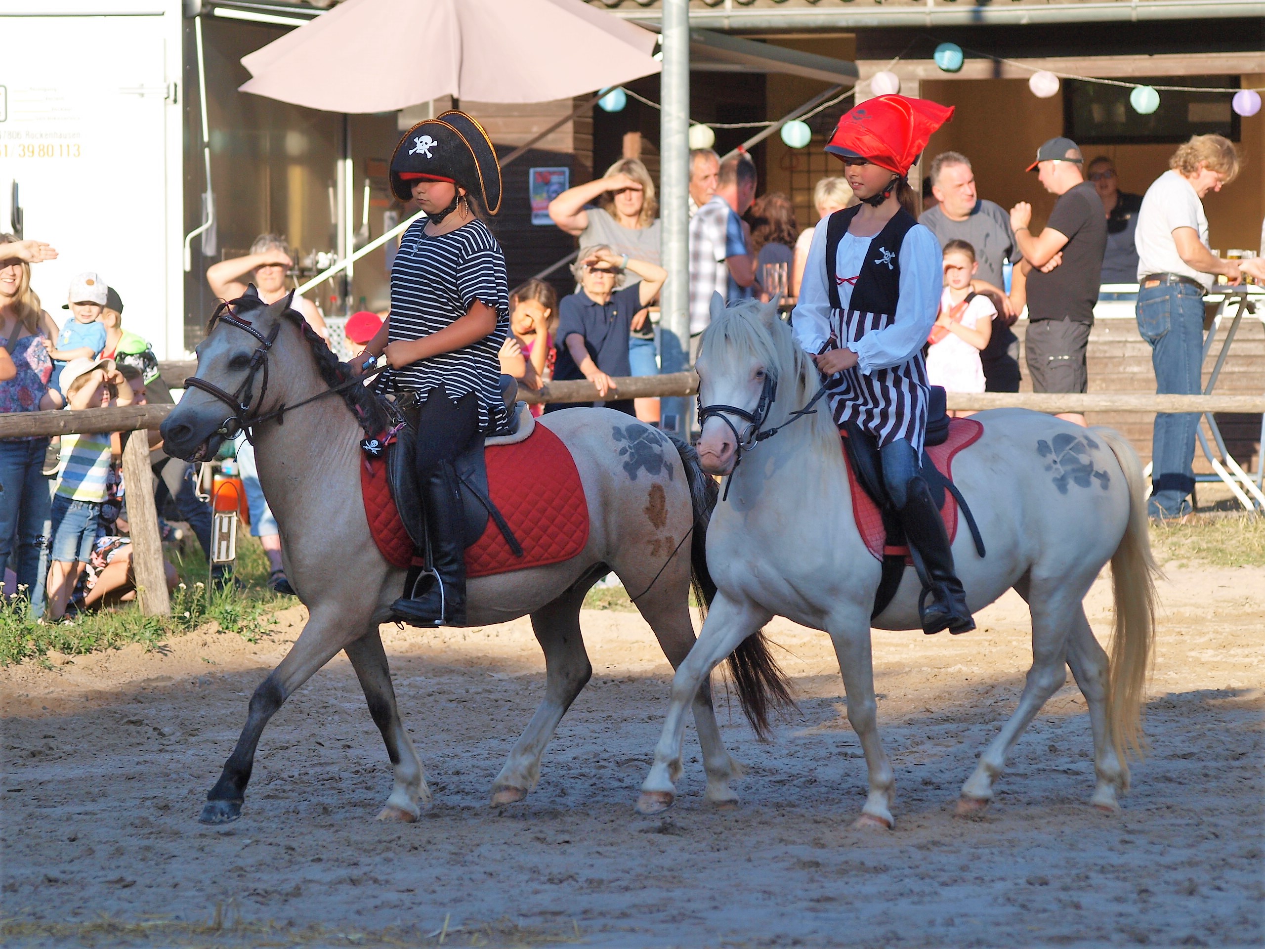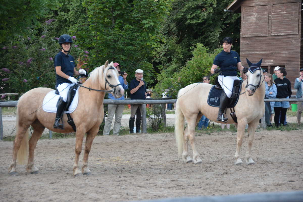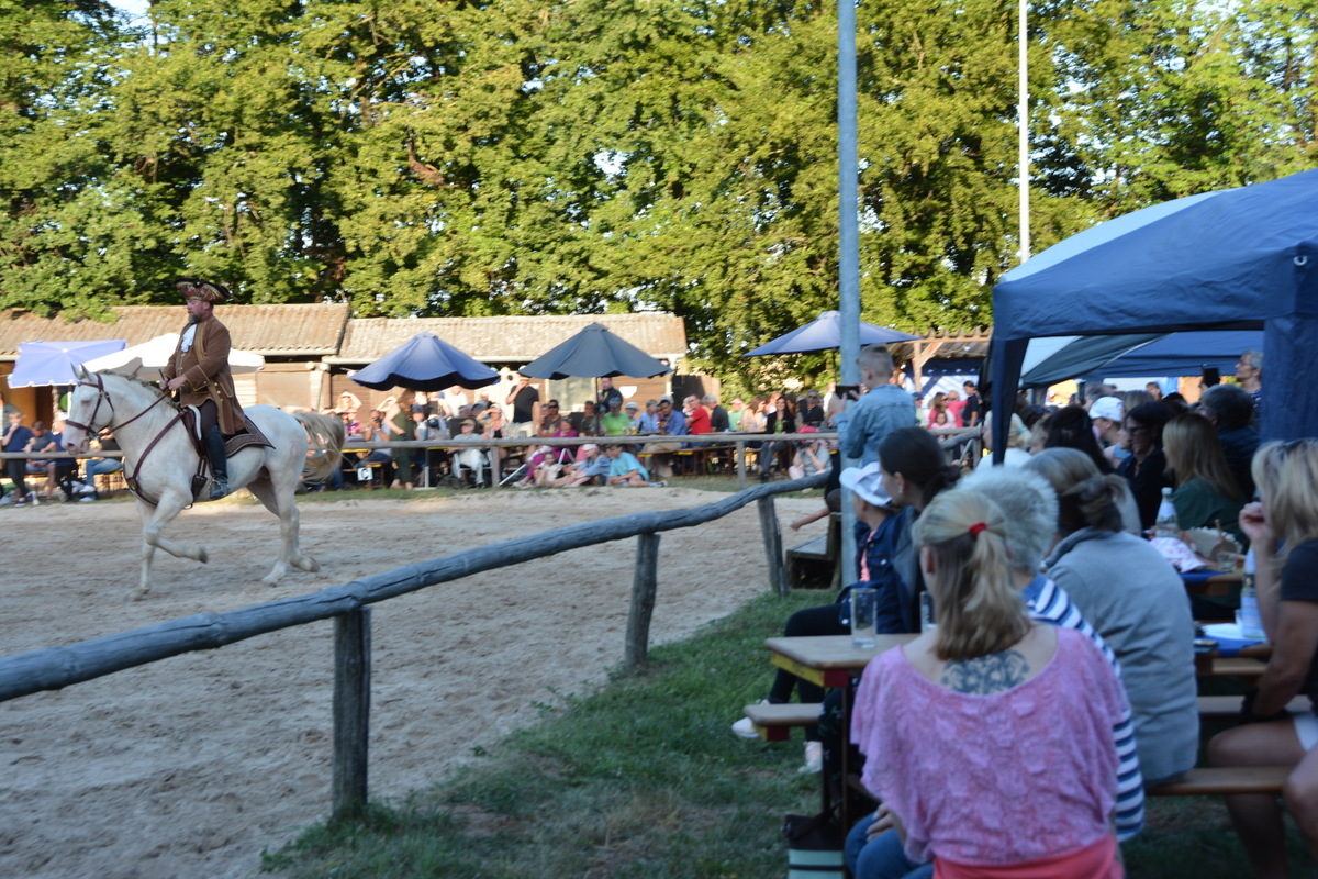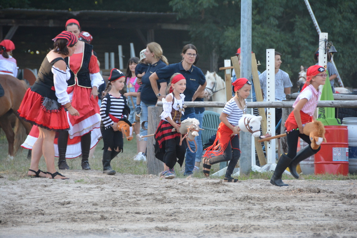 Zunächst aber war geselliges Treffen mit Getränken und gutem Essen, z.T. in Eigenregie gefertigt, angesagt. Gegen 19.00 Uhr startete dann die große Jubiläumsschau. Nach den offiziellen Grußworten demonstrierte eine Reiterin auf ihrem Welsh Cob die Vielseitigkeit dieser Rasse. Bei dem Schaubild „Fluch der Karibik“ kamen auch die Kleinsten auf ihren Steckenpferden zum Einsatz. Ein schönes Bild, das zeigte, dass der Ponyverein für Jung und Alt, Klein und Groß da ist. Nach einer Voltigiervorführung auf dem Holzpferd folgte das Vier-Generationen-Bild. Kaum zu glauben, aber es ritten Urgroßmutter, Großmutter, Mutter und Kind ein und alle auf Welsh! Imponierend auch die Vorführung einer klassischen Dressur – diesmal aber auf einem Spanier.