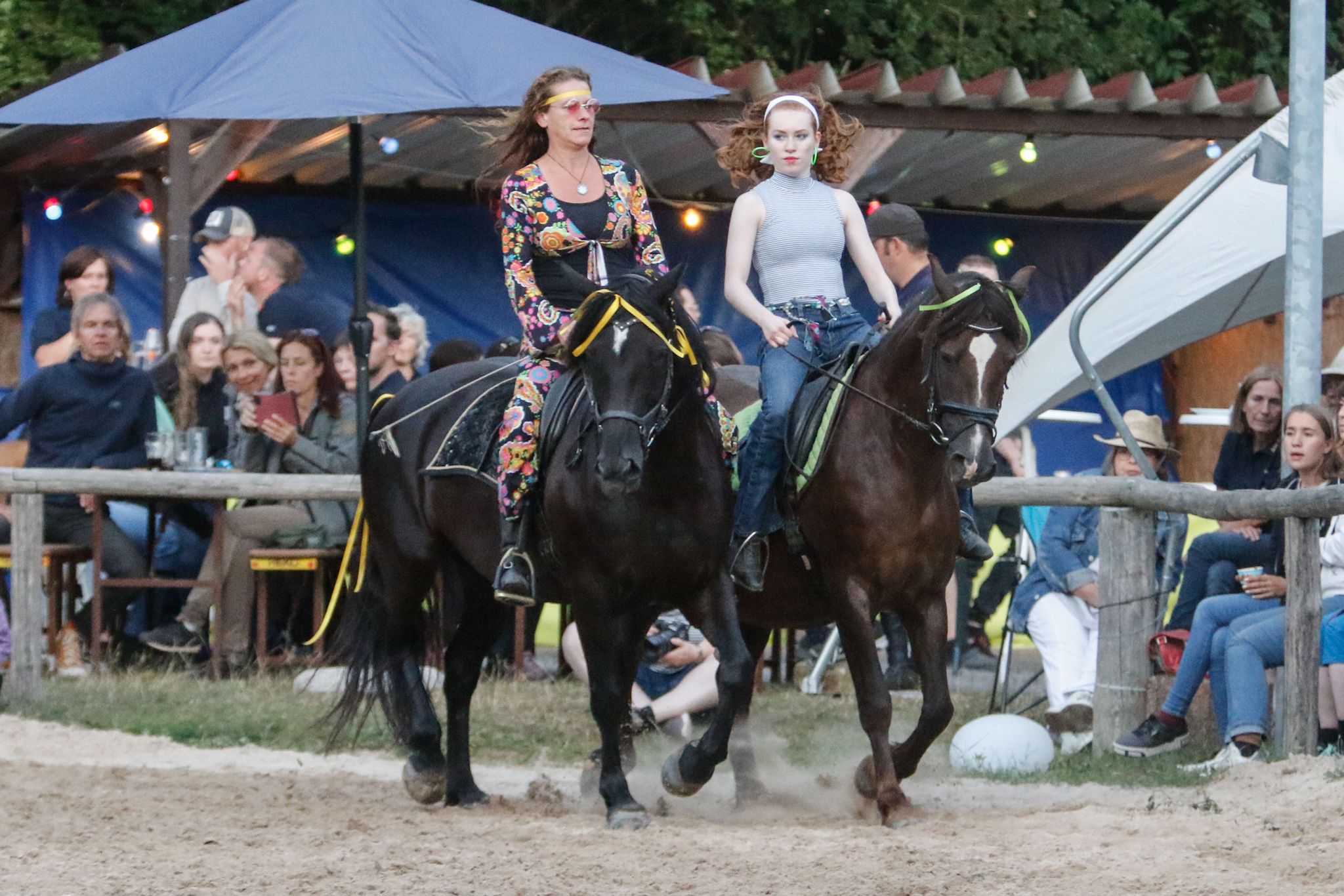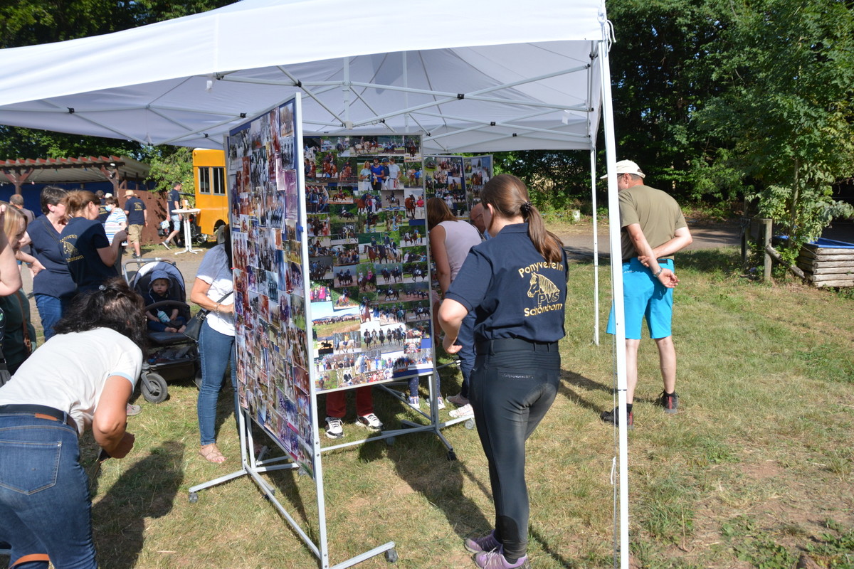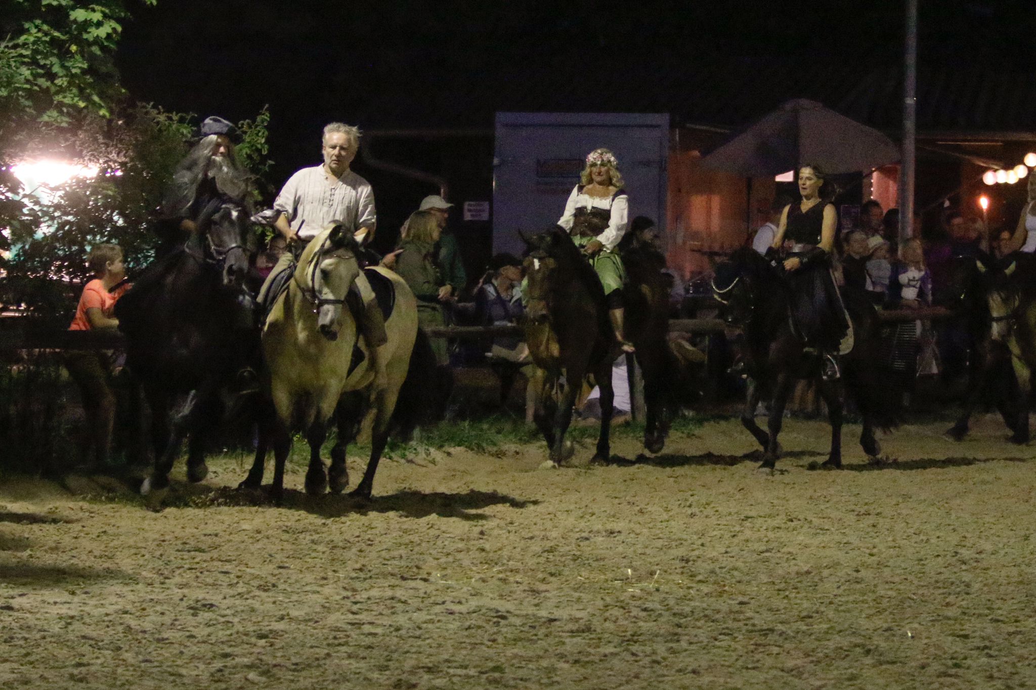 Zunächst aber war geselliges Treffen mit Getränken und gutem Essen, z.T. in Eigenregie gefertigt, angesagt. Gegen 19.00 Uhr startete dann die große Jubiläumsschau. Nach den offiziellen Grußworten demonstrierte eine Reiterin auf ihrem Welsh Cob die Vielseitigkeit dieser Rasse. Bei dem Schaubild „Fluch der Karibik“ kamen auch die Kleinsten auf ihren Steckenpferden zum Einsatz. Ein schönes Bild, das zeigte, dass der Ponyverein für Jung und Alt, Klein und Groß da ist. Nach einer Voltigiervorführung auf dem Holzpferd folgte das Vier-Generationen-Bild. Kaum zu glauben, aber es ritten Urgroßmutter, Großmutter, Mutter und Kind ein und alle auf Welsh! Imponierend auch die Vorführung einer klassischen Dressur – diesmal aber auf einem Spanier.