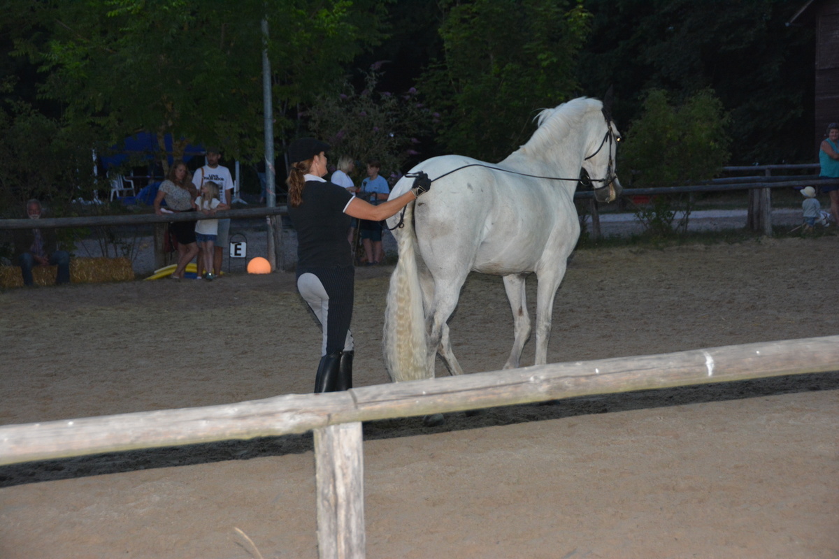 Nach einer kurzen Pause zeigte eine Reiterin, ebenfalls auf einem Spanier, Aufgaben aus einem Working Equitation Trail. Dann wollte man es wissen – wer wird der Schnellste sein im Speedtrail? Zwei Cobs und ein Spanier traten gegeneinander an. Reiter und Pferde gaben alles, mit knappem Vorsprung siegte der Welsh Cob. Allmählich wurde es dunkel und die Flutlichtanlage wurde eingeschaltet – was der Veranstaltung noch einen extra Flair gab (für die Fotografen war es jedoch eine Herausforderung).