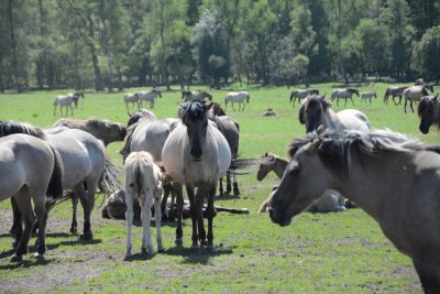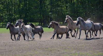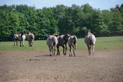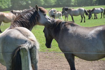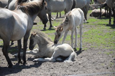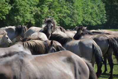 Gegen 13:30 Uhr fuhren wir zur Wildpferdebahn in den Merfelder Bruch. Da am Samstag, den 27.05.2017 der traditionelle Wildpferdefang stattfinden soll, war die Herde mit über 300 Ponys schon auf einer Weidefläche in der Nähe der Arena. Bei einem Rundgang über das weitläufige Gelände hatten wir die Möglichkeit die Ponys aus der Nähe zu betrachten. Die überwiegende Anzahl der Ponys sind Grau- und Sandfalben mit Aalstrich, Schulterkreuz und Zebrastreifen an den Beinen, einige wenige Braun- und Schwarzbraunfalben. Mehrere haben jedoch weiße Abzeichen am Kopf, die eigentlich unerwünscht sind, sich aber durch den Einfluss verschiedener Hengste vererbt haben. Es wurden in der Vergangenheit Huzulen-, Exmoor-, Welsh- und Highlandhengste eingesetzt, was man einigen Ponys durchaus noch ansehen konnte. In den letzten Jahrzehnten wurden aber ausschließlich polnische Konikhengste und zuletzt reine Wildbahnhengste eingesetzt, um die Urform der Wildpferde zu erhalten.