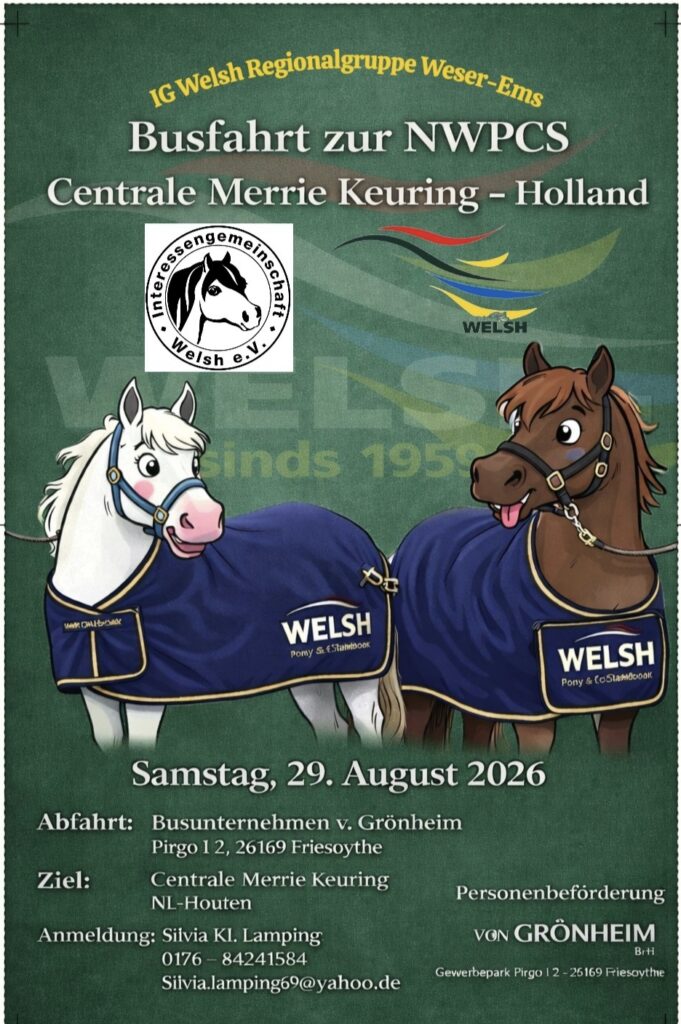 Busfahrt zur NWPCS Centrale Merrie Keuring 18. Februar 2026Keine KommentareRegionalgruppe Weser-Ems Gefällt Ihnen der Inhalt? Teilen Sie ihn mit Ihren Freunden. Facebook Twitter Google Plus Linked In Email Beitragsnavigation Das Welsh-Jahrbuch 2026 – bald erhältlichAusschreibung Regionalschau Weser-Ems