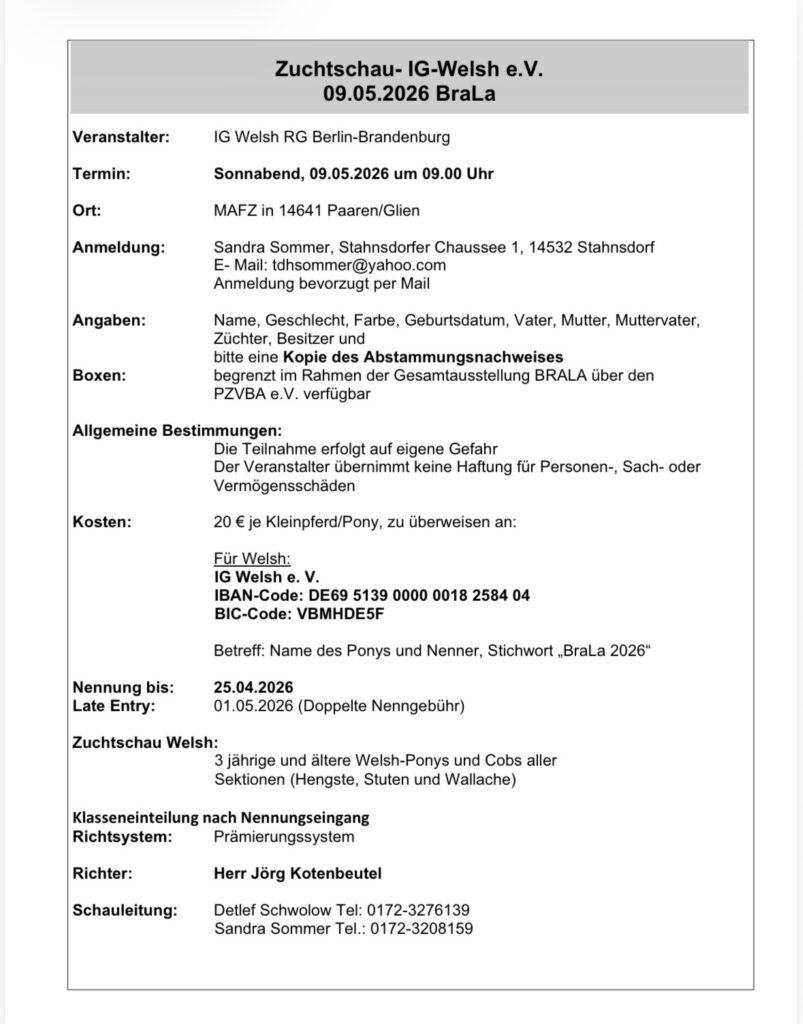 Ausschreibung Zuchtschau 09.05.2026 im Rahmen der BraLa Hier geht´s zur Ausschreibung.