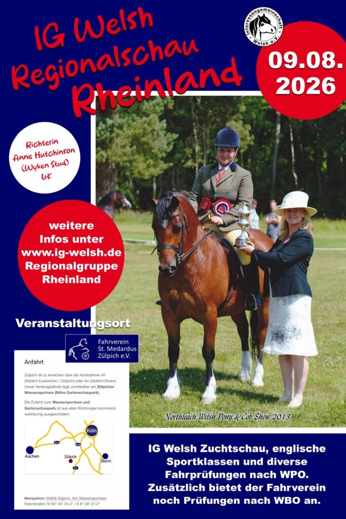Bekanntgabe Richterin für die Regionalschau im Rheinland Die Regionalschau im Rheinland findet am 15.09.2024 in 50181 Bedburg-Rath statt. Die Richterin in diesem Jahr heißt Mrs. Anne Hutchinson (Wyken Stud). Wir freuen uns auf eine tolle Schau! Am 14.09.2024 findet der Züchterabend statt.