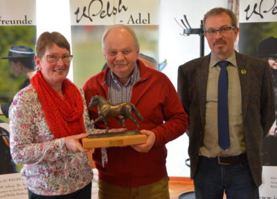 Am 24. März war es wieder einmal soweit – aus allen Teilen Deutschlands reisten die Delegierten der IG Welsh in das hessische Alsfeld-Eudorf, um im Landgasthaus Hotel „Zum Schäferhof“ an der diesjährigen Delegiertenversammlung teilzunehmen. Der 1. Vorsitzende Herr Dr. Klaus Spengler zeigte sich erfreut, dass so viele Personen anwesend waren und die Versammlung beschlussfähig war. Nach der Begrüßung und dem Gedenken an die verstorbenen Mitglieder wurden einige Ehrungen vorgenommen. In diesem Jahr konnten 4 Mitglieder für ihre 40-jährige Mitgliedschaft, 22 für ihre 25-jährige Mitgliedschaft und 47 für ihre 10-jährige Mitgliedschaft geehrt werden. Für ihre besonderen Verdienste in der IG Welsh wurden Marianne und Rupert Nutz aus Bayern mit einer Pferdestatue geehrt.