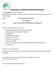 IMG_2546 2 23. September 2025Keine Kommentare Gefällt Ihnen der Inhalt? Teilen Sie ihn mit Ihren Freunden. Facebook Twitter Google Plus Linked In Email Beitrags-Navigation Einladung Herbstversammlung Regionalgruppe Hannover