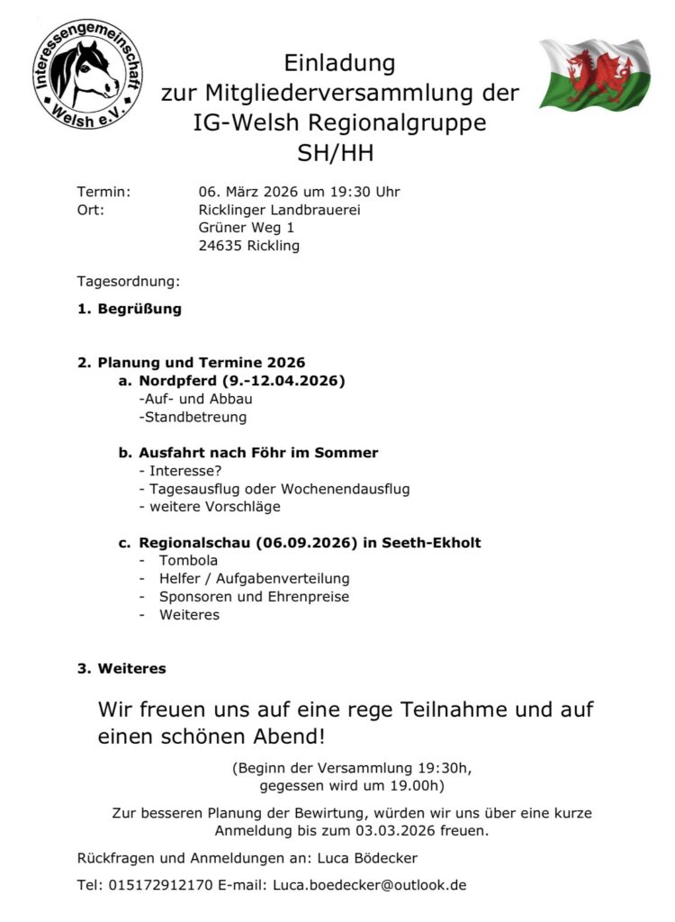Einladung Mitgliederversammlung SH/HH 9. Februar 2026Keine KommentareRegionalgruppe Schleswig-Holstein/HH Einladung Mitgliederversammlung SH/HH Wir laden euch herzlich zur Mitgliederversammlung am 6. März in Rickling ein. Es wird um die Planung unserer Termine 2026 gehen. Wir freuen uns auf eine rege Teilnahme. IG Welsh SH Einladung März 2026 Gefällt Ihnen der Inhalt? Teilen Sie ihn mit Ihren Freunden. Facebook Twitter Google Plus Linked In Email Beitragsnavigation Grünkohlessen der Regionalgruppe Weser-Ems 2026Ausschreibung Regionalschau Hannover