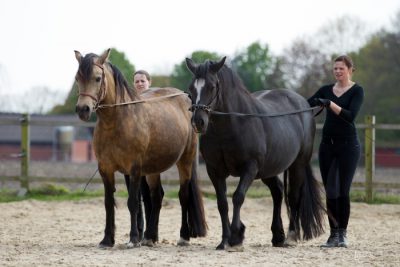 Anschließend hatte Corina Marko für uns eine kleine Vorstellung der Ponys auf dem Reitplatz organisiert. Die hochtragenden Zuchtstuten Holsteins Silanda und Sharon wurden von zwei jungen Frauen fachkunding am Langzügel nach stimmiger Musik vorgestellt. Danach zog der Junghengst Brennabor Lord Marwyn entspannt seine Runden und ließ sich auch vom Publikum nicht aus der Ruhe bringen. Die Cob-Stute Silwen beeindruckte mit ihrer außergewöhnlichen Farbe und ihrem Charme. Mit Begeisterung zeigte sie uns ihre Zirkuslektionen.