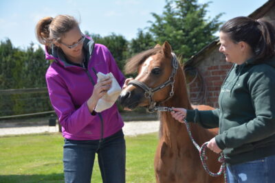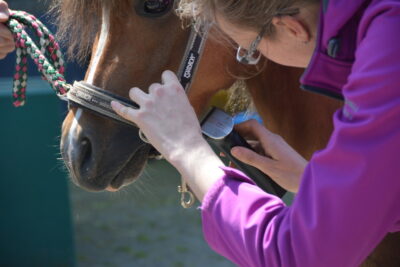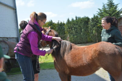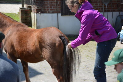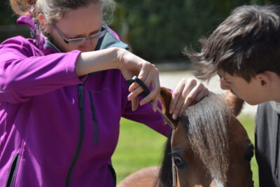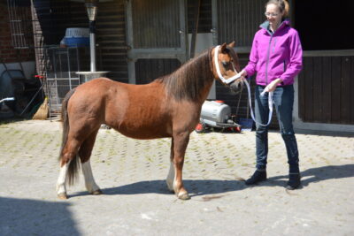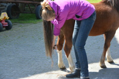 Danach ging es ans Pony. Hierfür stellte Andrea die 5jährige Welsh A Stute „Leybucht`s Conny“ zur Verfügung. Ilka zeigte, wo und wie man welche überflüssigen Haare abschneidet und welche auf jeden Fall stehen bleiben müssen, wie die Mähne ausgedünnt wird und wie der Schweif am Tag vor der Schau einflochten wird, damit er am Schautag perfekt aussieht. Außerdem wie der Ponykopf durch Einreiben mit Öl oder Creme an den richtigen Stellen, noch ausdrucksvoller wird. Sie erklärte uns, wie und womit man die weißen Beine einreibt, damit sie auf der Schau strahlend weiß sind und zeigte uns die verschiedensten Pflegeprodukte. Im Anschluss beantwortete Ilka noch Fragen, bevor wir zum gemütlichen Teil übergehen konnten. Mit leckeren Grillwürstchen im Brötchen, Salaten und gekühlten Getränken haben wir den Himmelfahrtsausflug ausklingen lassen.