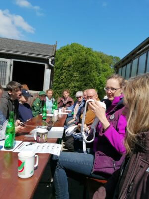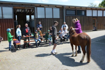 Am Donnerstag, den 18.05.2023 haben wir uns, mit fast 30 Teilnehmern, auf dem Hof von Familie Dr. Sascha und Andrea Harbig in Sprockhövel getroffen, um bei Ilka Rosenthal an einen Schauvorbereitungslehrgang teilzunehmen. Um erst einmal anzukommen, standen Kaffee und Kuchen bereit und man kam direkt ins Gespräch. Anschließend wurden uns von Andrea die Pferde und Ponys in den Stallungen und auf der Weide gezeigt. Nachdem wir die Tische und Bänke auf den Hof gestellt hatten, hielt Ilka einen kleinen Vortrag darüber, wann man beginnt, die Schausaison zu planen und welche Dinge Monate, Wochen und Tage vorher erledigt werden sollten. Sie gab gute Tipps zum Training und zur Ausrüstung von Pony und Vorführer und erklärte sehr anschaulich, was im Zuchtring zu beachten ist. Da fast jeder Teilnehmer das ein oder andere Anekdötchen beitragen konnte, hatten wir viel Spaß.