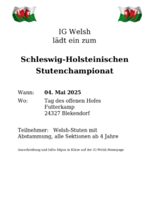 image0 11. Februar 2025Keine Kommentare Gefällt Ihnen der Inhalt? Teilen Sie ihn mit Ihren Freunden. Facebook Twitter Google Plus Linked In Email Beitrags-Navigation IG Welsh lädt ein zum Schleswig-Holsteinischen Stutenchampionat
