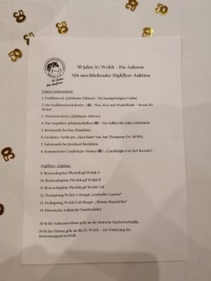 Für den weiteren Verlauf des Abends hatten sich Sarah Blümle und Anna-Lena Spiekermann etwas ganz Besonderes ausgedacht: Eine Auktion besonderer Welsh-Unikate mit anschließendem Highflyer-Sale. Die einzelnen Auktionslose hatten schon beim Aufbau große Beachtung gefunden und waren bunt durchmischt. Von einem „Candlelight Dinner forTwo (eine Dose Ravioli mit einer Kerze) und dem goldenen Jubiläumshalfter, über eine handgefertigte und gravierte Vorführpeitsche, Skulpturen von Welsh Pony-Köpfen,Decksprünge von bekannten Hengsten bis hin zu einer von Hermann Schmitt gestifteten über 100 Jahre alten walisischen Familienbibel in schwerem Ledereinband mit Messingbeschlägen.