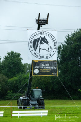 Pünktlich zum Schaubeginn um 9 Uhr setzte dann der Dauerregen ein und trotzdem kamen etliche Zuschauer auf das große Schaugelände mit dem gut präparierten großen Zuchtring und umfangreichen Verpflegungsmöglichkeiten, um die wunderschön herausgebrachten Ponys aller Welsh Sektionen mit ihren Vorführern und Reitern zu bewundern. Auch nasse Welsh Ponys sind immer noch eine Augenweide. Glücklicherweise stand die Reithalle der Anlage den Vorführern und Reitern als trockener Vorbereitungsplatz zur Verfügung.