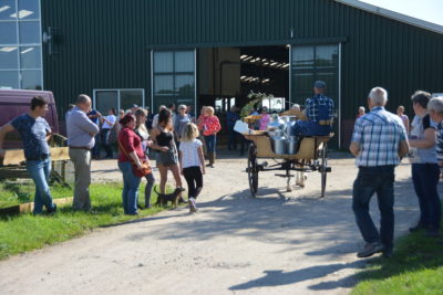 Der Empfang fand auf einem riesigen Milchviehbetrieb in der Nähe von Henks Domizil statt, wo Kaffee, Limo und Kuchen gereicht wurden. Gut 30 Welsh-Enthusiasten hatten sich eingefunden, darunter auch fünf IGler, und nach einer kurzen Begrüßung und Bestaunen eines holländischen Milchwägelchens, natürlich gezogen von einem Welsh C, überreichte uns Henk eine ausführliche Beschreibung der Tiere, die wir nun sehen sollten. Wir begaben uns wieder zu unseren Autos und der erste Stopp war Weide Nr. 1, wo wir die jungen Hengste River Bonnie Prince Charley, 4j. C-Hengst v. Parc Sir William, sowie die Cobs Ruska Andreas, 2j. v. Rhencullen Playboy und Ruska Joshua, 1j. v. Nebo Jonsi, bewundern konnten.