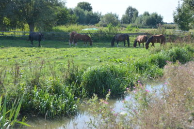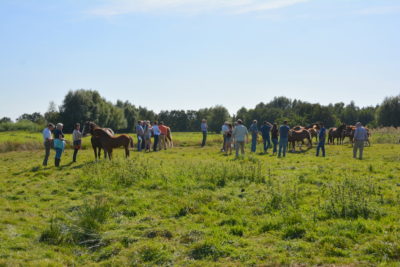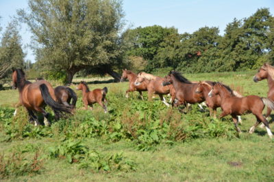 Beeindruckend Weide Nr. 2 – eine riesige Fläche, umgeben von Wassergräben, und darauf die Ruska/River-Herde von drei Welsh Cob- und drei Welsh C-Stuten jeweils mit Fohlen bei Fuß sowie eine gedeckte Stute. Kein alltäglicher Besuch für die Tiere, unsere Truppe – da zog man es doch vor, zunächst einmal in wildem Galopp davonzustürmen. Aber dann siegte doch die Neugier und wir durften die Ruska/River-Damen auch einmal aus der Nähe betrachten. Auffällig die Dunkelbraune Ruska Afina, 6j. v. Ruska Ambrose. Henk bewies einmal mehr, dass ihm in puncto Abstammung keiner so schnell was nachmacht, er konnte jedes Tier ausführlich beschreiben.