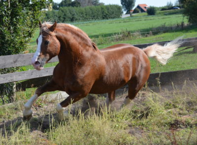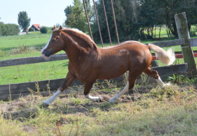 Nebenan, auf Weide Nr. 3 sechs weitere, z.T. auch junge Stuten, alle selbst gezogen. Der Rückweg führte uns noch zu dem Stall, wo die drei Hengste, ein C und zwei Cobs standen. Henk ließ es sich nicht nehmen, jeden Hengst herauszuholen und im Roundpen zu präsentieren. Zunächst den C-Hengst Neuaddparc Master Class vom bekannten Moorcroft The Master. Rhencullen Playboy, ein Rapphengst von Ruska Mab Y Brenin durfte auch seine Runden drehen und zuletzt der auffällige Fuchshengst Ruska Ambrose, auf den wir schon im Stall ein Auge geworfen hatten, da er durch seinen wunderschönen, vom Welsh-Adel gezeichneten Kopf, direkt auffiel. Auch draußen, im Roundpen, wurden wir nicht enttäuscht. Ambrose strotzte vor Bewegungsdrang und zeigte, welche Bewegungsqualität in ihm steckt.