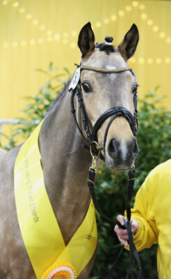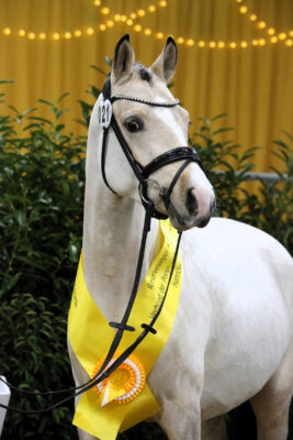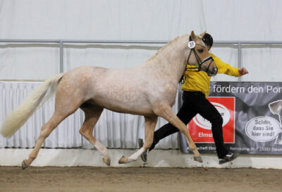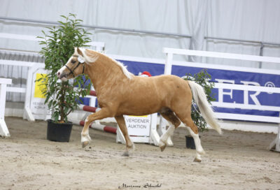 In den Niederlanden gezogen steppte Broekland Velvet Vingino v. Synod Gold Flake/ Crumpwell Shamson energisch ausgreifend durch die Bahn und ertrabte sich den Sieg und die Prämienanwartschaft bei den Welsh A Ponys. Dieser typvolle Palomino wird auf dem Gestüt Feikenhof bei Sönke Buchholz in Hohne Züchtern zur Verfügung stehen.