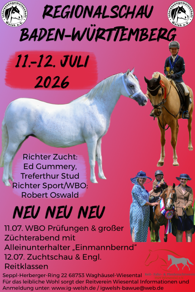 Regionalschau Baden-Württemberg 24. Januar 2026Keine KommentareRegionalgruppe Baden-Württemberg !Save the date! Gefällt Ihnen der Inhalt? Teilen Sie ihn mit Ihren Freunden. Facebook Twitter Google Plus Linked In Email Beitragsnavigation Welsh Sports FestivalWorkshop Zucht & Sport Baden-Württemberg