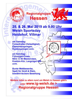 Die Regionalgruppe Hessen bietet allen Welsh-Freunden auch dieses Jahr zwei Veranstaltungen an! Den Welsh Sportsday am 25. & 26. Mai 2019, gut erreichbar an der A3 in Villmar und mit einen vielseitigen Sportangebot inklusiv Geländeritt in wunderschöner Landschaft, sowie am 16. Juni die Regionalschau mit den Englischen Sportklassen erstmals auf dem Hof Eselmühle der Familie Hoffarth in Lohra, Nähe Marburg.