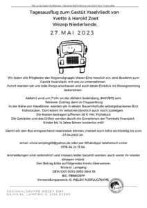 Tagesausflug Weser Ems Ysselvliedt 5. April 2023Keine Kommentare Gefällt Ihnen der Inhalt? Teilen Sie ihn mit Ihren Freunden. Facebook Twitter Google Plus Linked In Email Beitrags-Navigation Tagesausflug zum Gestüt Ysselvliedt
