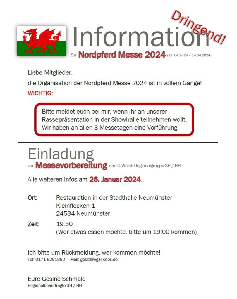 die Nordpferd Messe in Neumünster steht vor der Tür. Wir laden jeden ein, der Interesse hat bei der Messe mitzuwirken – ob am Messestand, Helfer beim Auf- oder Abbau des Standes oder gerne mit oder ohne Pony an unserer Rassepräsentation. Kommt am 26. Januar zum Treffen!