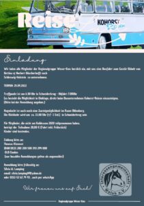Weser-Ems Ausflug 2022 22. April 2022Keine Kommentare Gefällt Ihnen der Inhalt? Teilen Sie ihn mit Ihren Freunden. Facebook Twitter Google Plus Linked In Email Beitragsnavigation Weser-Ems Ausflug 2022