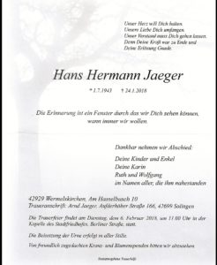 Jaeger 2. Februar 2018Keine Kommentare Gefällt Ihnen der Inhalt? Teilen Sie ihn mit Ihren Freunden. Facebook Twitter Google Plus Linked In Email Beitrags-Navigation Wir trauern um Hans Hermann Jaeger